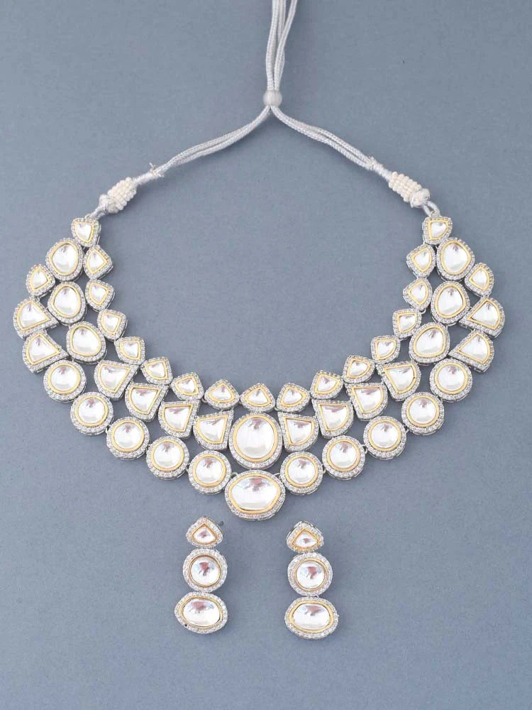 This necklace is the ultimate accessory option for the festive season. This set has a gorgeous circular floral pattern. The necklace has vibrant pearl detailing all over. The set also has a bright element of Kundan detailing in its structure. So, don't miss out on this gorgeous necklace set this eventful season as you have ramps to walk ahead.
